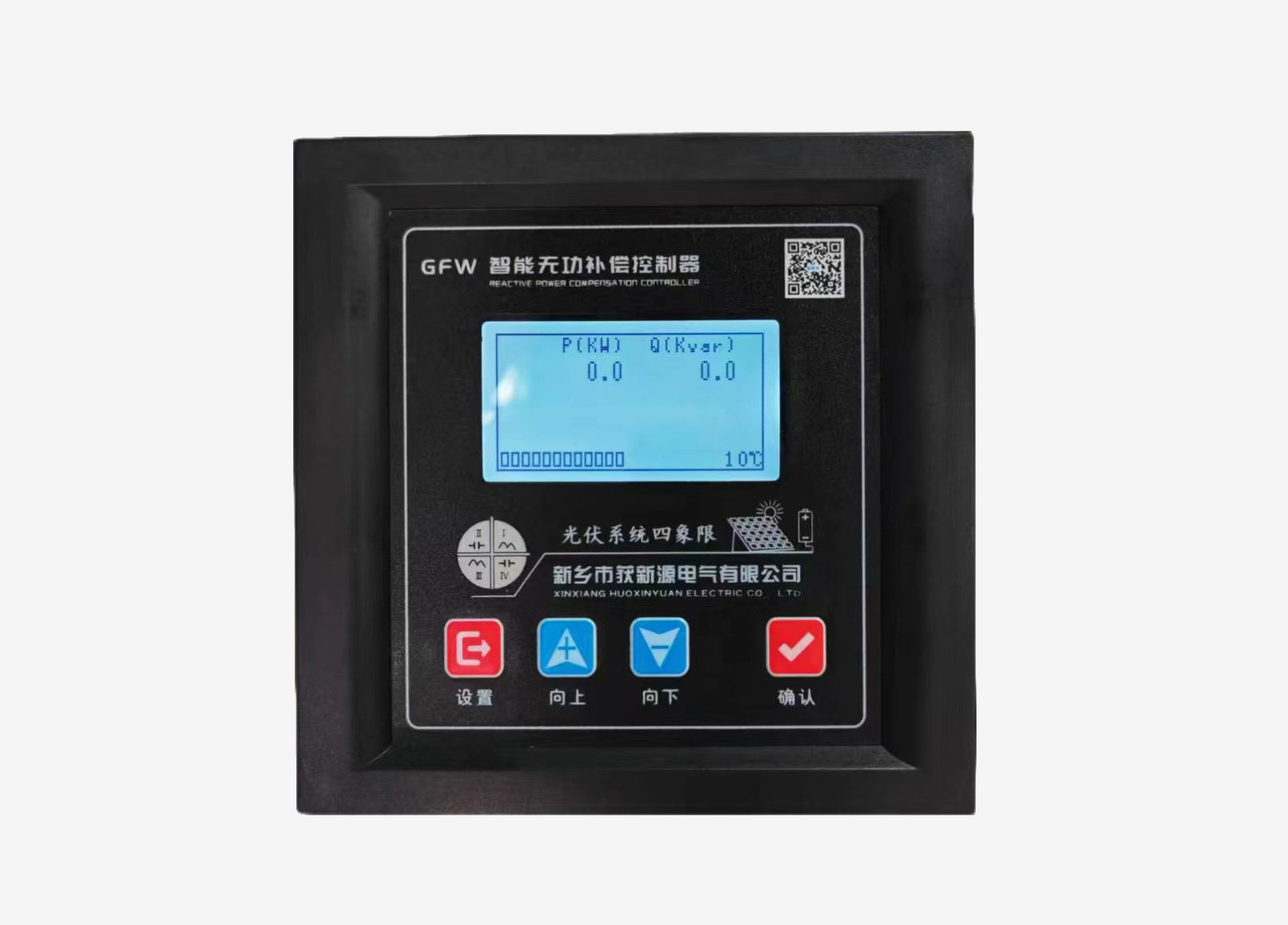 中文實時顯示電網功率因數、電壓、電流、有功/無功功率、電壓總諧波畸變率、電流總諧波畸變率、頻率、電容器投、切狀態和故障報警狀態。